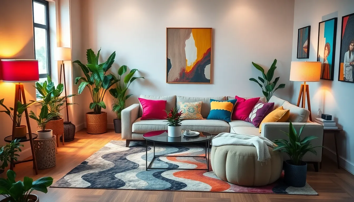 Transform a living room with comfortable furniture and vibrant decor. Embrace bold accent colors on pillows or artwork to create visual interest. Incorporate layered lighting through lamps and ceiling fixtures, establishing a warm ambiance. Adding a statement rug can enhance the space’s coziness while defining seating areas. Artwork positioned strategically will draw the eye and enhance the room’s focal points. Indoor plants add life and freshness to the environment, contributing to a welcoming atmosphere.