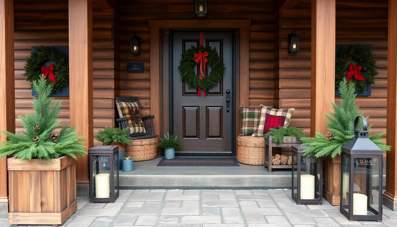 Wooden decorations stand out as key features of the rustic theme. Cedar planters alongside the steps provide a natural touch while displaying seasonal greenery. Incorporating burlap in wreaths or table runners adds texture and a traditional feel. Pinecones, twigs, and branches can fill lanterns or be used in centerpieces. Using stone accents, like a small fire pit or pathway stones, complements the overall design. Incorporating these natural materials fosters a cozy atmosphere that invites guests.